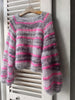 Bundin úr erva og niður. Tað gráa er bundið við einum tráði og tað pinklitaða (strípurnar) við tveimum tráðum saman.
